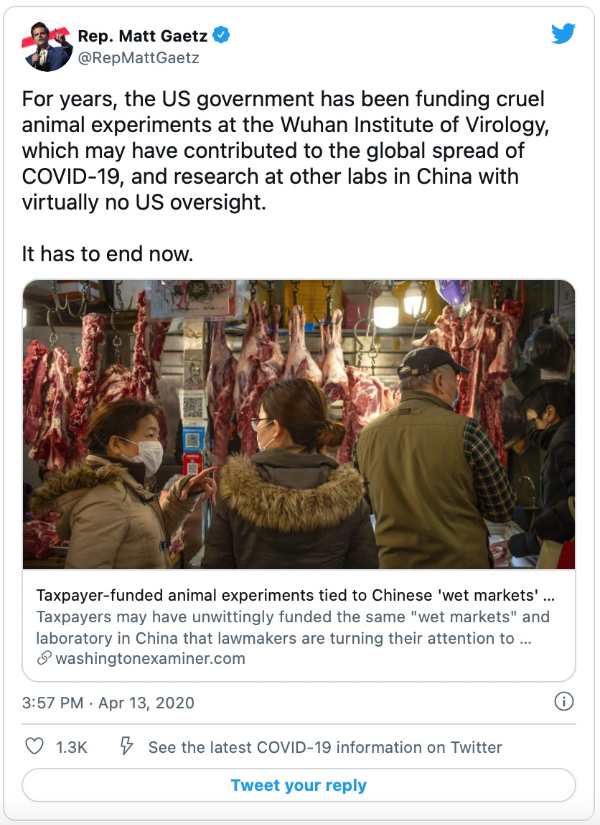 This internal NIH email to Dr. Collins and Dr. Fauci complains that “The WH [White House] has strongly embraced concerns raised by Congressman Gaetz who is publicly criticizing HHS/NIH for funding the Wuhan laboratory’s bat research. ”