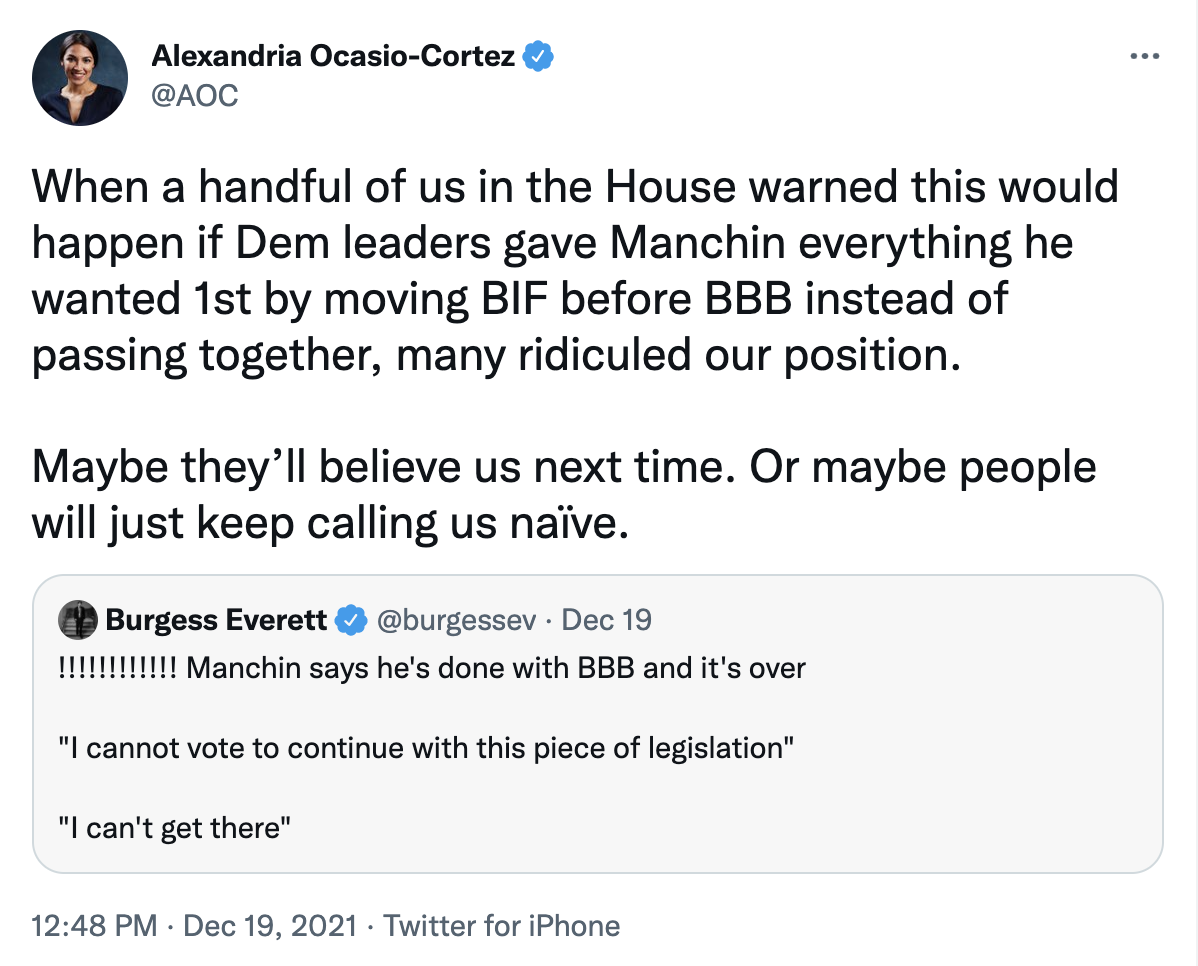 The Squad was right not to trust corporate Democrats like Joe Manchin. Corporate Democrats promised the people they would pass Build Back Better (BBB) if Congress just passed a bipartisan infrastructure bill (BIF) first. Now, Manchin says he can’t support Build Back Better.