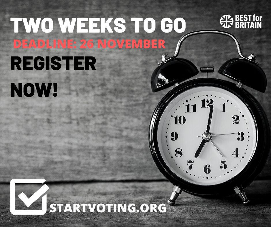 Dear John,The deadline to register to vote is in just two weeks.My friend Kate assumed she was registered to vote.She pays council tax, she's lived in the same place for many years, she likes to think she's politically engaged. But Kate was actually one of the 9 million people in this country who were not correctly registered. As of September, nearly 1 in 5 voters were not registered. That’s why we’ve launched StartVoting.org. It’s an easy and quick way to register or apply for a postal vote. It only takes five minutes. All you need is your address and your National Insurance number. Do it now, and be sure you can vote this December. We want everyone to participate in this election. But people like Boris Johnson and Farage would rather you stayed home on 12 December. Even if you voted in the last election, even if you’re 99% sure it’s done, even if you’re like Kate and you think you’re registered, it’s worth taking five minutes to make sure. It doesn’t matter if you register twice. It’s better to waste five minutes than be turned away from the polling station.