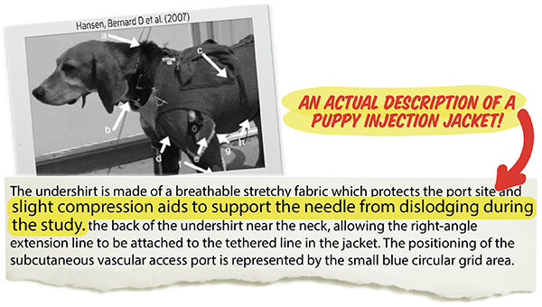 - INJECTION JACKETS: Then, through special drug injection jackets, the puppies are shot up with cocaine over and over and over again… for months on end.