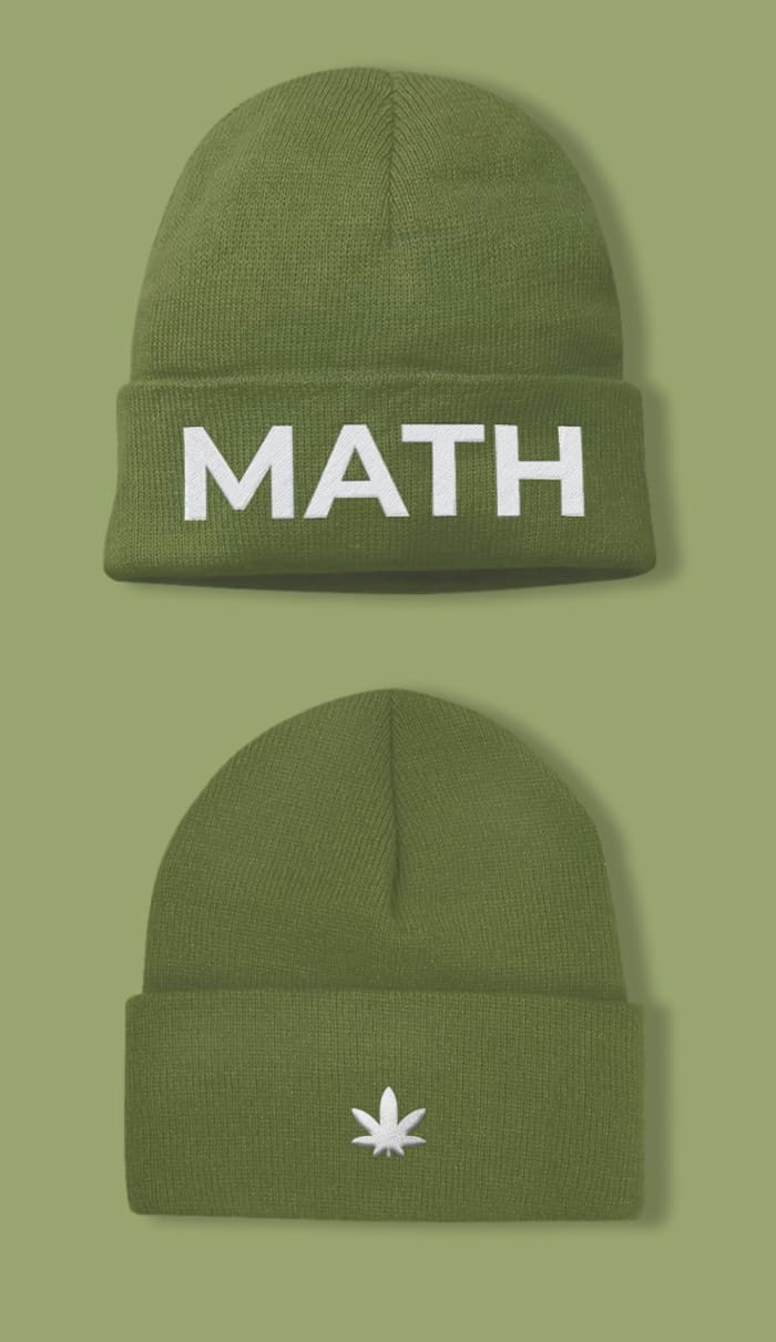 Green beanie with math embroidered in white in the front and marijuana leaf on the back