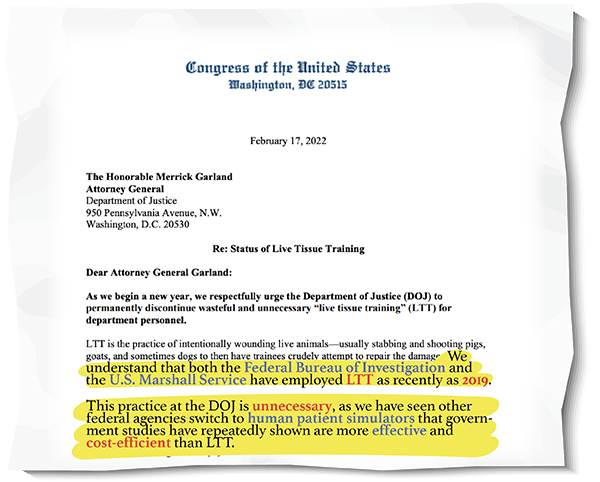Taxpayer – I've noticed you have not yet asked your members of Congress to end live tissue training (LTT) at the Dept. of Justice (DOJ).