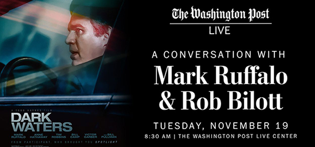 Don't miss the Washington Post's live event on the new film, Dark Waters: Hear Mark Ruffalo, Rob Bilott and Emily Donovan discuss the film and help launch our campaign against PFAS.