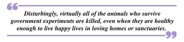 Disturbingly, virtually all of the animals who survive government experiments are killed, even when they are healthy enough to live happy lives in loving homes or sanctuaries.
