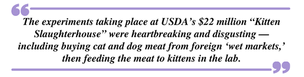 A similar scenario played out at the USDA, which for decades had run the government’s largest cat lab. The experiments taking place at USDA’s $22 million “Kitten Slaughterhouse” were heartbreaking and disgusting — including buying cat and dog meat from foreign ‘wet markets,’ then feeding the meat to kittens in the lab.