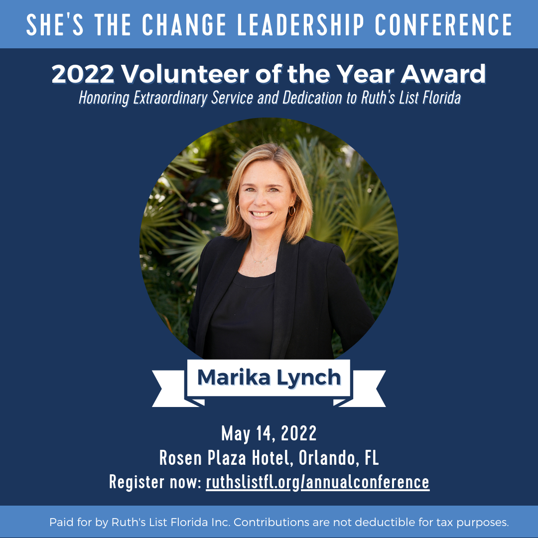 Dear Friend, Ruth’s List Florida is thrilled to share that Marika Lynch will receive the 2022 Volunteer of the Year Award at our annual She’s the Change Leadership Conference. The award honors her years of extraordinary service and dedication to Ruth's List Florida on both the state and local level.