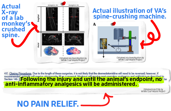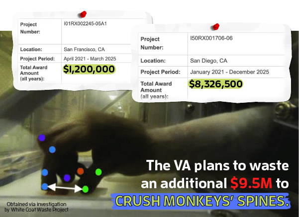 BREAKING: White Coat Waste Project (WCW) investigators just discovered the San Diego and San Francisco Dept. of Veterans Affairs (VA) are extending their horrific SPINE-CRUSHING primate experiments in California for another THREE YEARS!
