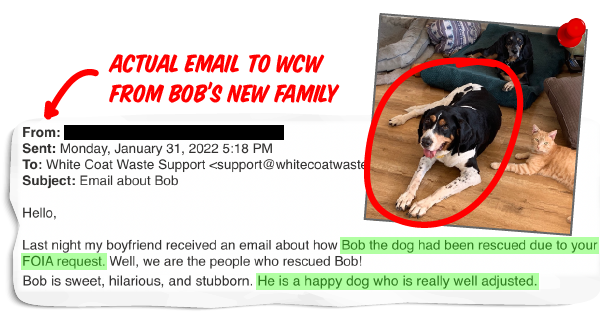 Today, Bob lives with a loving family who recently reached out to tell us how happy he is outside the lab.