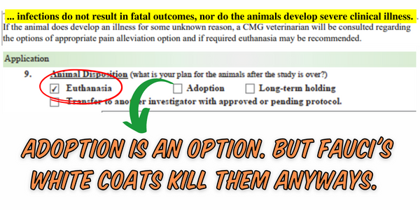 Fauci's white coats will watch the puppies suffer for eight weeks with painful infections and then willingly slaughter all 108 of them… even though they have the option to treat the infections and adopt out the puppies to loving taxpayer homes afterward.