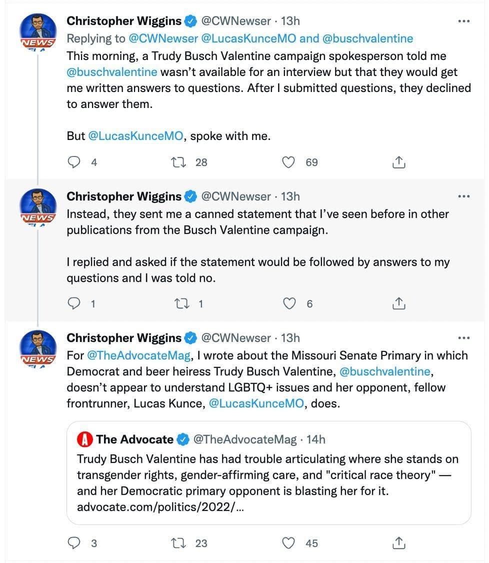 John — After multiple offensive comments from Trudy Busch Valentine — Lucas’ top primary opponent — about the LGBTQ+ community, Trudy is now refusing to speak to LGBTQ+ media.