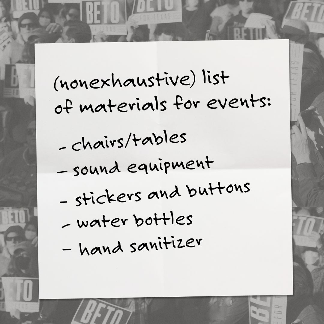 A nonexhaustive list of materials for events: chairs, tables, sound equipment, stickers and buttons, water bottles, hand sanitizer.