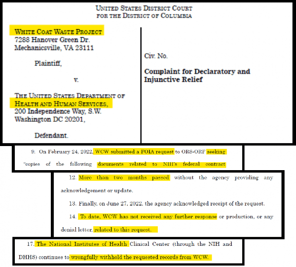 After months of getting the runaround, this week, WCW filed two lawsuits against the NIH, demanding that they turn over details on their septic shock experiments and contracts with Envigo.