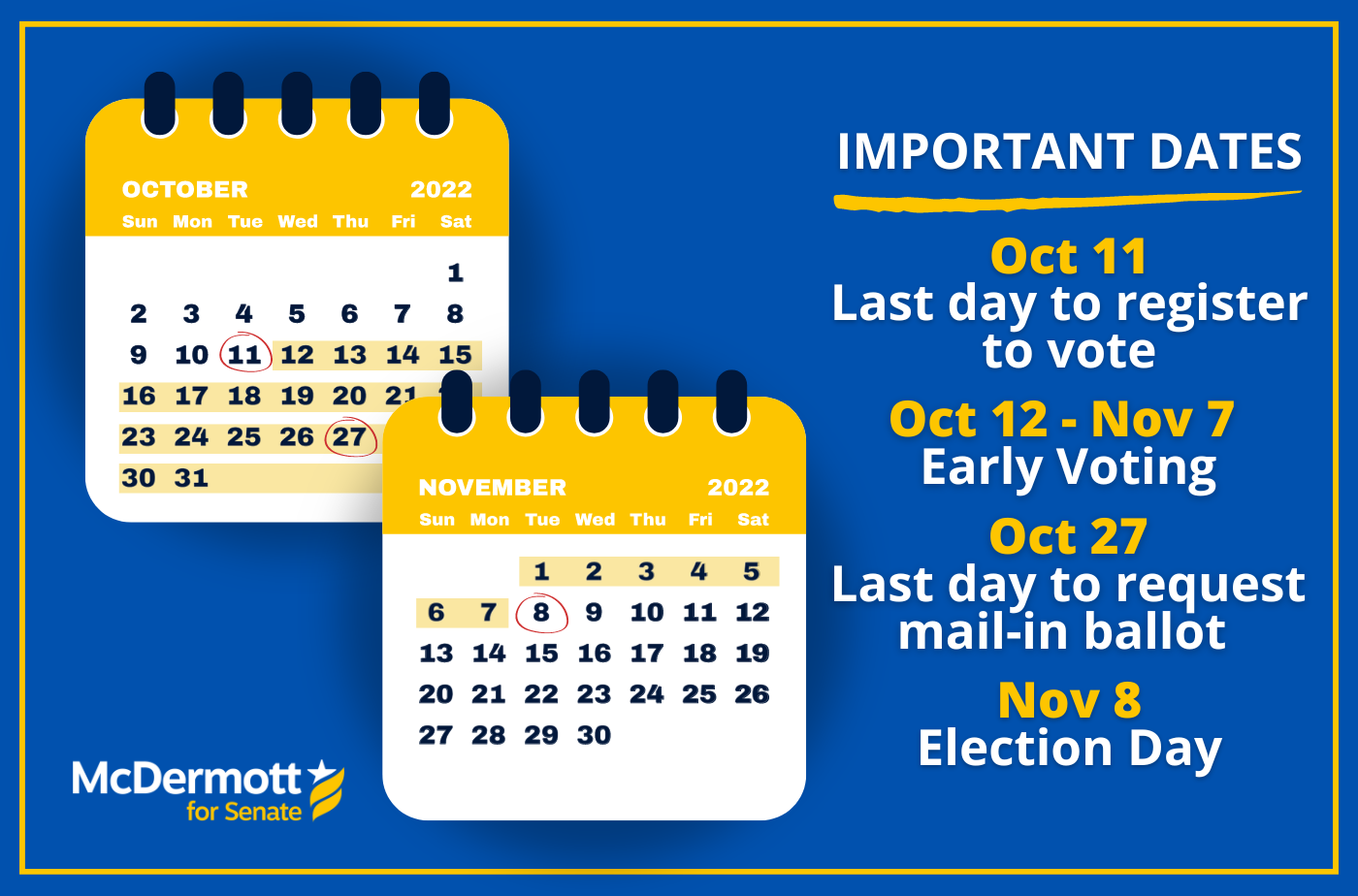 John now that you’re registered, we want to make sure that you don’t miss any important dates. The last day to register to vote is October 11th and early voting begins Wednesday, October 12th. |