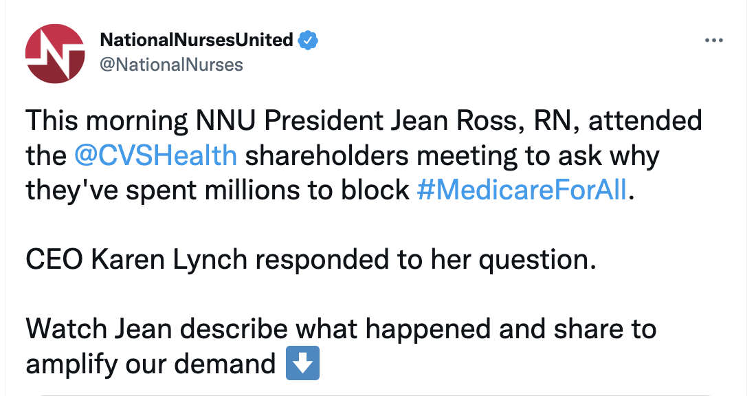 CVS says that they want to increase health care access to underserved communities. Nurses support Medicare for All because it is the best model to guarantee health care to patients who need it most.