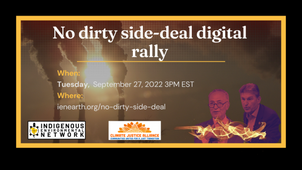 Say no dirty side-deal! Join us this week for a digital rally co-hosted by Climate Justice Alliance (CJA) and Indigenous Environmental Network (IEN) to fight against the handout to the gas and oil industry, the Permitting Reform Bill.