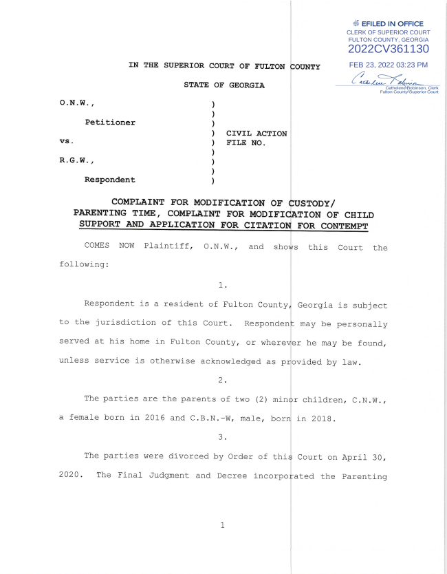 Ndoye Also Requested That Warnock Be Cited For “Willful Contempt,” Charging That He Refused To Allow Her To Retrieve Personal Property From Their Marital Home And Repeatedly Failed To Reimburse Her For Childcare Expenses – Even Peppering Her With Questions About The Necessity Of Such Expenses. (Fulton County Superior Court, Case 2022CV361130, Complaint For Modification of Custody, Filed 2/23/22; Pgs. 7-11)