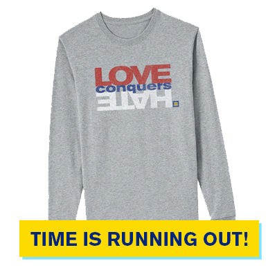 By wearing your Love Conquers Hate shirt, you’ll make a strong personal statement — that you believe that everyone deserves to be treated fairly and with respect. Your support will fuel the fight for LGBTQ equality in your hometown and all around the country.