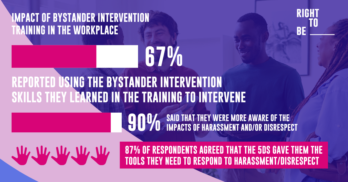 The goal of the training is to reduce instances of workplace harassment through the use of Right To Be’s proven 5Ds methodology – Distract, Delegate, Document, Delay, and Direct. Many respondents reported using these strategies more than once!