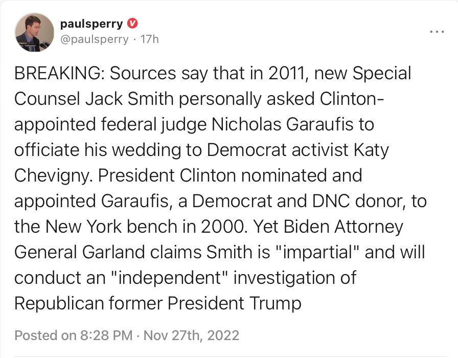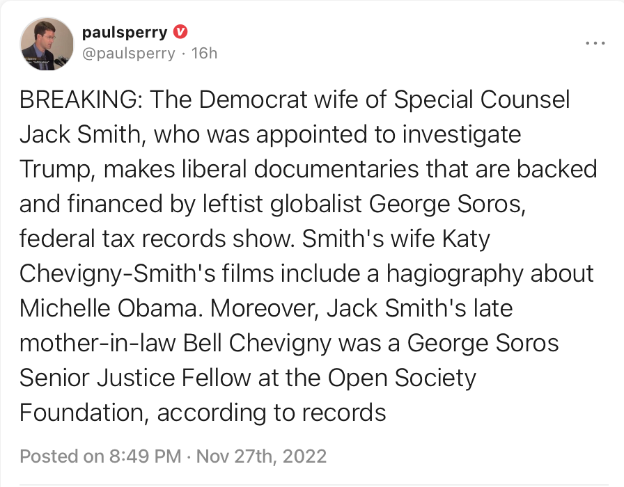 Read the article here . ICYMI: Paul Sperry Reports on Jack Smith’s Democrat Ties —And I'm supposed to get a fair shake from this person, who's under tremendous pressure from his family, but he is actually worse than they are? Can Republicans, and fair-minded people, generally, allow this to happen? Jack Smith is nothing less than a hit man for Obama, his Attorney General Eric Holder, and Andrew Weissmann. Weaponization. Our Country is in big trouble, a real mess!