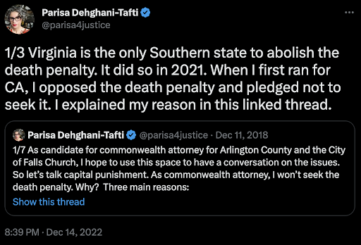 Parisa also got rid of the death penalty. This is huge because Virginia had put 1,389 people to death — more than any other U.S state. Evidence shows that the death penalty is imposed disproportionately on Black and poor people. But worst, is the unreasonable risk that innocent individuals will be executed. There have been over 100 people who were killed by the death penalty but were later exonerated because they were actually innocent.