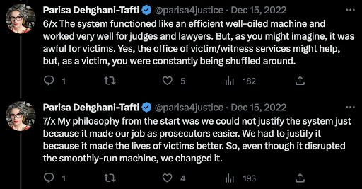 She didn’t stop there, Parisa made it a priority to support crime victims. She transformed the system to make sure that victims weren’t shuffled around from one prosecutor to another, where they have to tell their traumatizing experience over and over. Parisa ensured that victims had one prosecutor on the case from start to finish.
