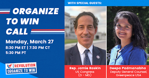 RSVP today to join our LIVE National Organize-to-Win Call with US Rep. Jamie Raskin (MD-18) and Greenpeace USA on Monday, March 27th at 8:30 pm ET/5:30 PT!
