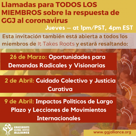 miembrxs, evaluar este momento político juntos y escuchar más de organizaciones y movimientos de todo el mundo que están respondiendo a esta crisis. GGJ discutirá Oportunidades para demandas radicales mañana, la primera de 3 llamadas en nuestra serie de llamadas semanales mañana, 26 de marzo a la 1 p.m. PST / 4 p.m. EST. Haga clic AQUÍ para confirmar su asistencia en las llamadas y para