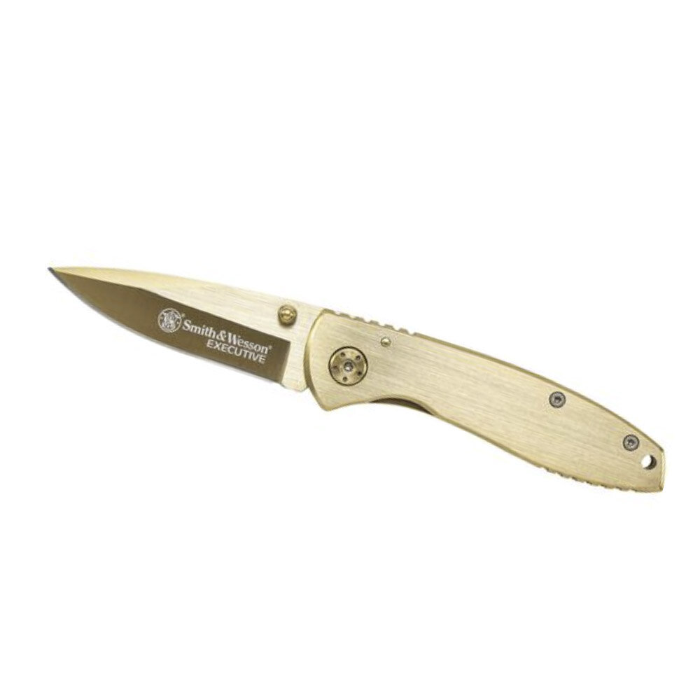 The gold titanium-coated handle exudes sophistication, while the frame lock ensures secure use. In addition, the ambidextrous thumb knobs and pocket clip makes the Smith & Wesson Executive Gold Knife perfect for everyday carry.
