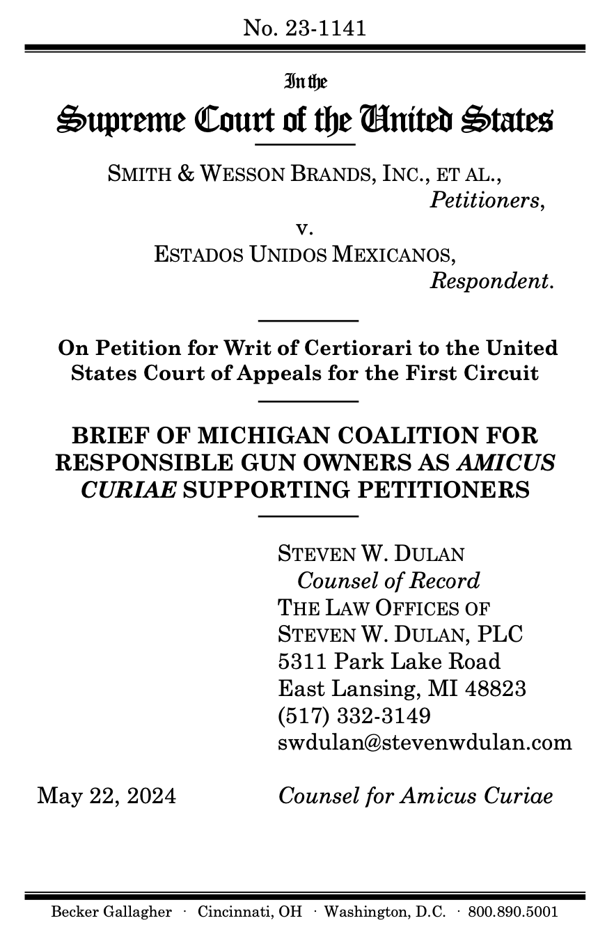 On January 22, 2024, in a landmark decision, the U.S. Court of Appeals for the First Circuit ruled in favor of the government of Mexico, allowing its lawsuit against U.S. gun manufacturers, including Smith & Wesson, to proceed. MCRGO has financed an amicus brief in the case on behalf of the firearms manufacturers. It can be read HERE or by clicking on the image below. We are asking for your voluntary contribution to assist in the fight against Mexico.