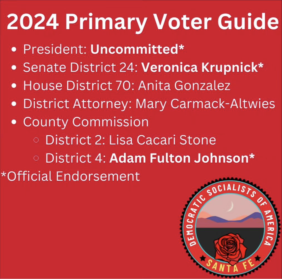 Friends and Comrades- Election Day is tomorrow! If you haven't had a chance to vote yet, we urge you to do so and hope you'll vote for our endorsed candidates in Senate District 24, County Commission District 4, and the Democratic Presidential Primary. No matter what, please make sure to get out and support whatever candidates matter to you. We've got opportunities to help support Veronica Krupnick and Adam Fulton Johnson on Election Day below.