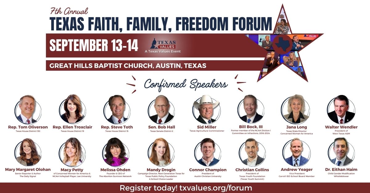 Texas Values 7th Annual Texas Faith, Family, and Freedom Forum is an exciting opportunity to hear directly from state and local representatives concerned with current issues impacting future generations and who are working towards preserving faith, family, and freedom in Texas.