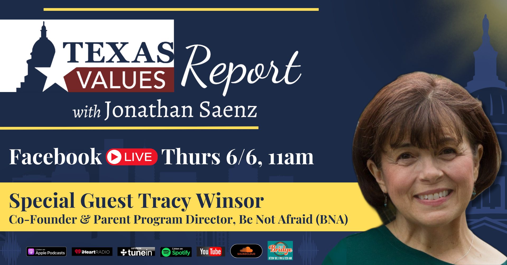 Catch the weekly Texas Values Report at any time, day or night, and on additional podcast sites: Apple, iHeartRadio, SoundCloud, Spotify, TuneIn, YouTube, The Bridge Austin.
