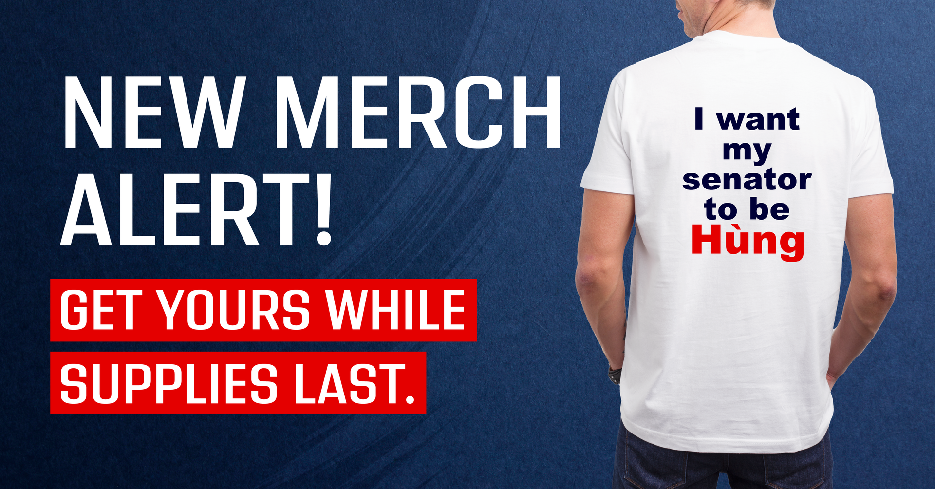 Hung is ready to take back the Senate this November, and if you want to as well we HIGHLY suggest you get your hands on our new merch before it sells out. Get your “I want my Senator to be Hùng” t-shirt now before it’s gone for good!