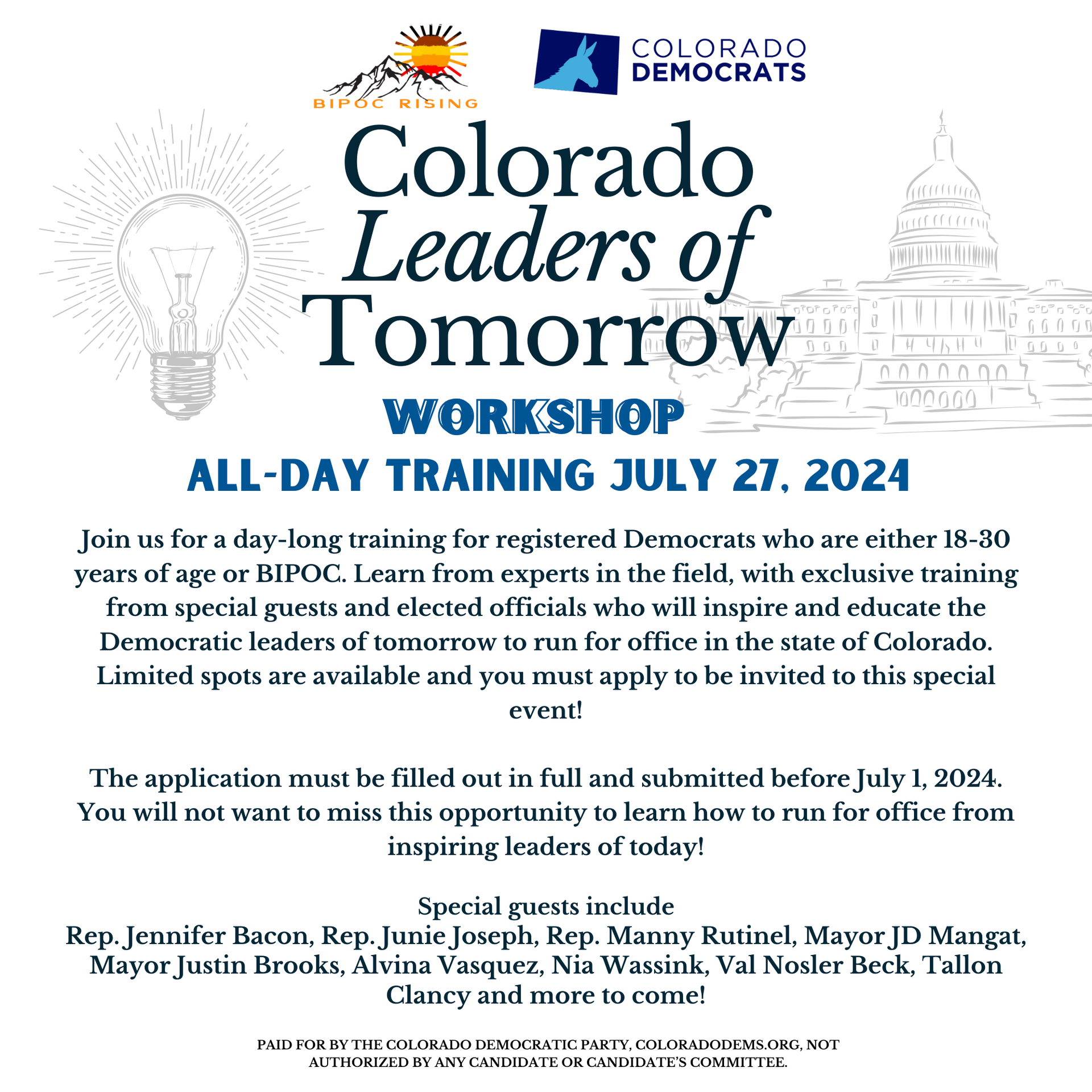 On July 27th, 2024, the Colorado Democratic Party and BIPOC Rising are hosting a day-long training for registered Democrats who are 18-45 years of age and/or BIPOC.