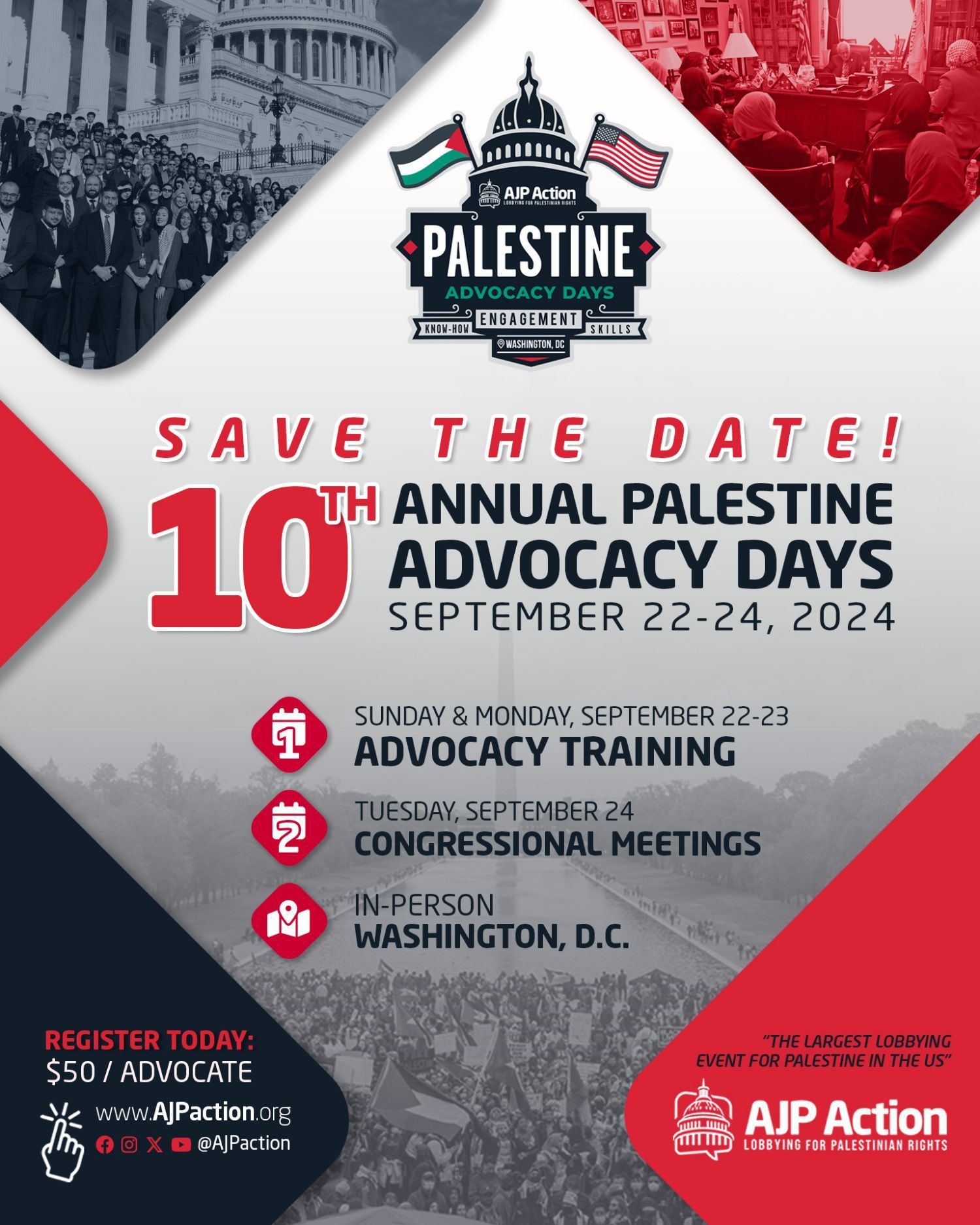 Demand Change, Revive Your Voice: Hearts in Gaza, Feet in Congress Dear Email, We're excited to announce the 10th Annual Palestine Advocacy Days, which will take place from September 22nd to 24th, 2024 in Washington, DC. Almost a full year of death and destruction in Gaza weighs heavily on our hearts. We have taken to the streets and marched on the White House in historic numbers. Now, we must channel our grief and outrage to ensure our representatives on the Hill do not forget. Show up for Gaza and for Palestine: help us make this the largest Palestine Advocacy Days Congress has ever seen. Click here to register for our 2024 Palestine Advocacy Days! Every year, we gather at our nation’s capital to meet with Members of Congress and share our stories to push for tangible policy change. As Americans, we have the power to be heard in many forums, and we cannot let the Halls of Congress be silent on the genocide of Palestinians as billions of US tax dollars bolster the Israeli regime. The days of minority support for Palestinian human rights are over — and we need to make sure Congress knows it. Thanks to dedicated efforts across the movement and your support for organizations like AJP Action and American Muslims for Palestine, we are stronger than ever. Our polling shows over 60% of Democrats and Independents in key states believe in conditioning aid that abets war crimes, and across likely voters nationwide, 55% support withholding all military aid until Israeli attacks on Gaza stop. This September, we can make clear that the will of the people is on the side of ending military aid to the Israeli regime, on the side of guaranteeing aid to UNRWA and rebuilding Gaza, and on the side of ending genocide and apartheid across Palestine. We will not stop, we will not rest until our government has halted the flow of weapons fueling this genocide. Join us. Together, we face a unique opportunity in election year in which positions on Gaza may determine the outcome. We can use this moment to advocate for lasting change if we continue to apply strategic pressure—with our hearts in Gaza and our feet in Congress. Register today — you will receive comprehensive training and skills for legislative advocacy. Stay tuned for more updates, and share with your friends and family. |