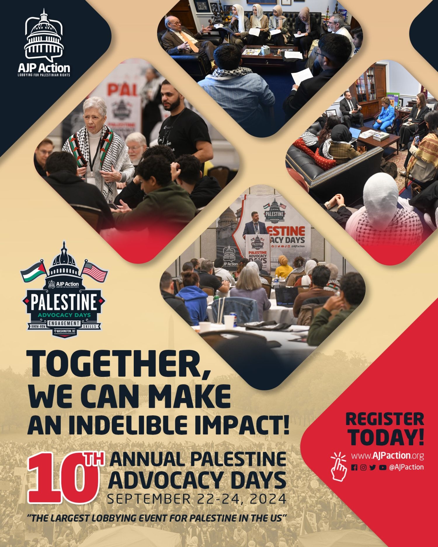 Register before September 4th for the special $50 rate and come lobby for Palestine Dear Email, This September 22nd through 24th you’ll have the opportunity to meet your Congress Members face to face and demand that they vote to stop the genocide in Gaza. The 10th Annual Palestine Advocacy Days (PAD) run by AJP Action brings hundreds of normal people like you to Washington D.C. every year to advocate for Palestine in person with Members of Congress and their staff. Palestine needs your voice now more than ever. Lobbying Congress in person is one of the most powerful tools we have to effect real change. Congress has the power to end the genocide with a single vote, but many representatives hear only from the Israel lobby. This is our chance to shift their thinking, challenge their narratives, and make sure they understand that most Americans do not reflect the Zionist lobby. We know it won’t be easy, but it’s essential. Millions of Palestinians are relying on us to keep pushing, to never give up, and to use every tool at our disposal to end Israel’s horrific occupation of Palestine. Though the path is difficult and often disheartening, we cannot afford to lose hope or slow down. Lives depend on our persistence and dedication. We are making progress. More Americans are recognizing the truth—that Palestinians are victims of a brutal regime. We’ve seen more mobilization against the Zionist lobby than ever before. The fact that they’re pouring hundreds of millions into this election cycle to undermine pro-Palestinian candidates shows just how powerful our movement is—and how much they fear our collective voice. Register today and take advantage of the special $50 rate before it ends on September 4th. This is your opportunity to stand up for justice, challenge Congress directly, and to be part of a historic movement. Be sure to WATCH our video below, REGISTER ASAP (before September 4th), and SHARE with your friends and family. |
