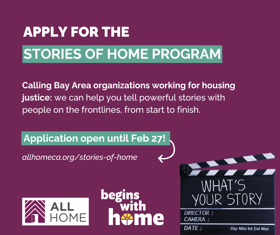 | The application for the much-anticipated second cohort of the Stories of Home program is now open! This initiative (formerly known as the Housing Justice Storytelling Initiative) is an intensive, multi-session workshop to develop and share video stories of courageous hope and collective action for housing justice that center Bay Area residents who have experienced housing insecurity. (Stories of Home is led by All Home, with support from NPH.) |