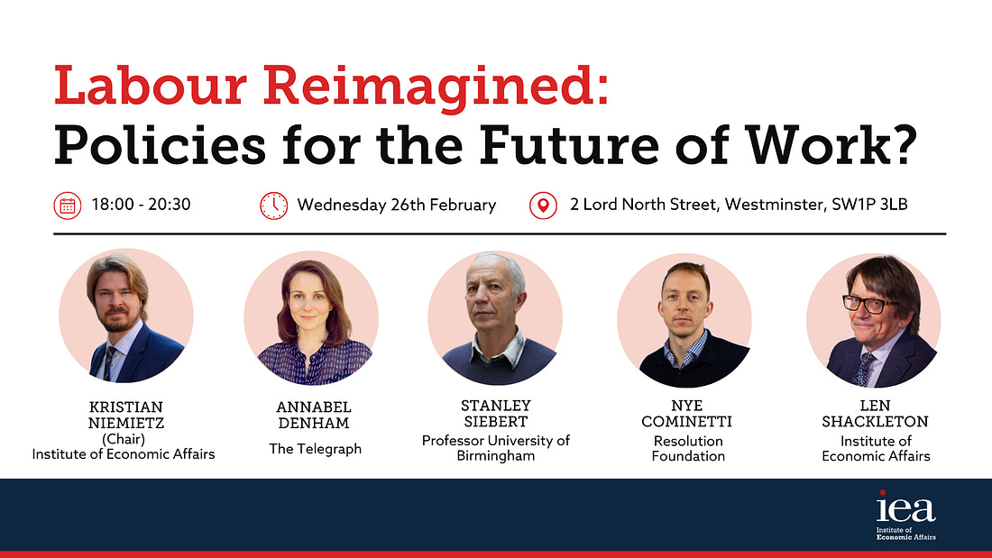 We are delighted to invite you to an upcoming Institute of Economic Affairs panel discussion, ‘Labour Reimagined: Policies for the Future of Work?’. This event will occur on Wednesday 26th February from 18:00 – 20:30 at the IEA (2 Lord North Street, Westminster, London, SW1P 3LB). The panel will discuss the government’s Employment Rights Bill, a piece of legislation with noble intentions but which risks piling pressure on the business community and further stifling economic growth. Chaired by Kristian Niemietz (Editorial Director at the Institute of Economic Affairs), panellists include Annabel Denham (Columnist and Acting Comment Editor at The Telegraph); Stanley Siebert (Professor of Labour Economics at the University of Birmingham); Len Shackleton (Editorial and Research Fellow at the Institute of Economic Affairs); and Nye Cominetti (Principal Economist at the Resolution Foundation). The discussion starts at 18:30 and will be preceded by drinks from 18:00. Spaces are limited and will be given on a first-come-first-serve basis. If you would like to attend, please RSVP to [email protected], call 020 7799 8910, or sign up below. IEA Panel Discussion on ‘Labour Reimagined: Policies for the Future of Work?’