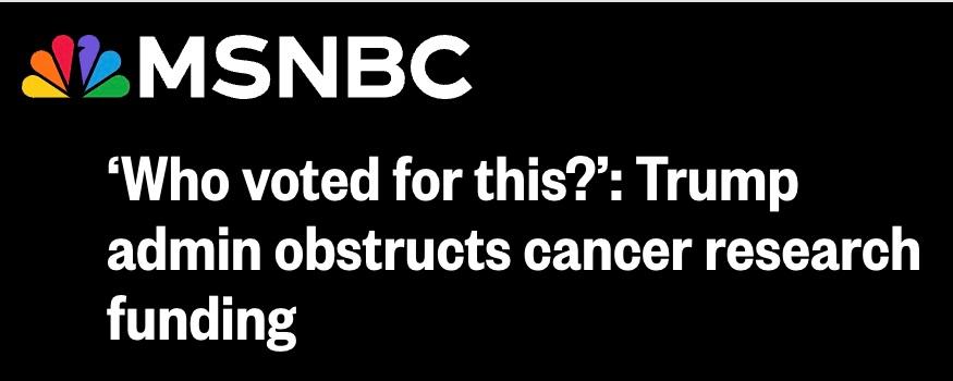 Cancer can affect anyone. It respects no class, race, or political position. There is no reason anyone should want to disrupt cancer research—Trump is just a deranged madman who cares only about himself, his wealth, and wielding power over others.