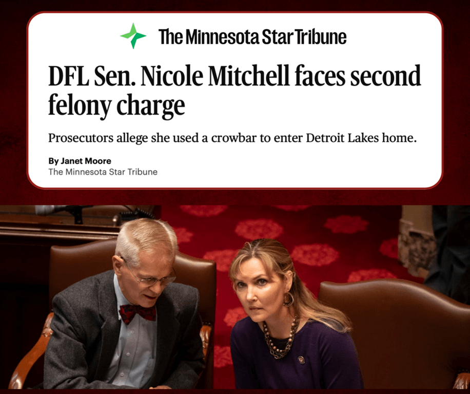 In case you missed it! Senator Nicole Mitchell was recently charged with a second felony for possessing burglary tools. This scandal continues to pull attention away from our important legislative work. It is long overdue to end this distraction and allow her voters to elect a new state senator.