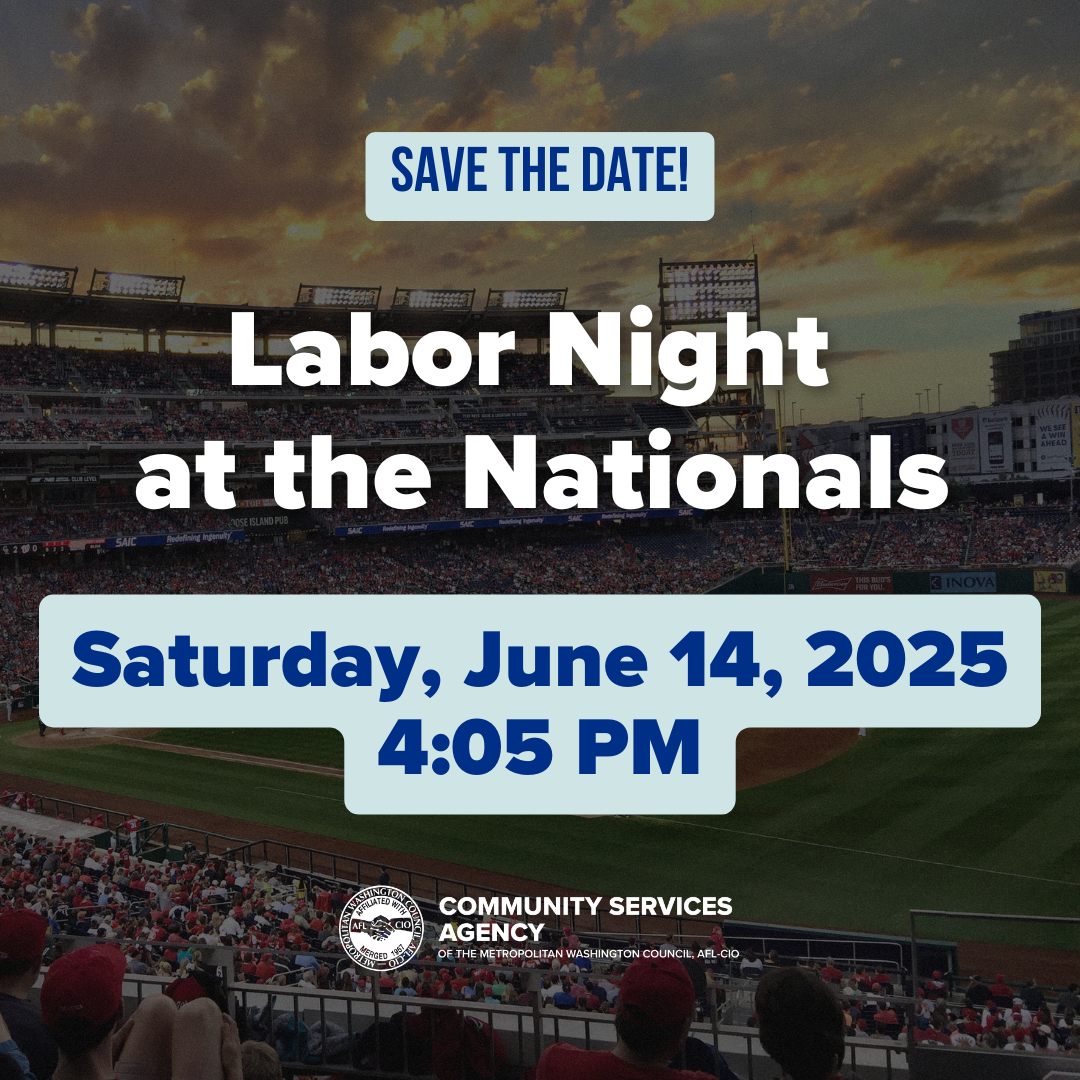 Mark your calendar for this annual tradition! The Community Services Agency's Labor Night at the Nationals will take place this year on Saturday, June 14, 2025. We'll catch the 4:05 PM game and raise funds for union families in our region. Group ticketing information to follow.