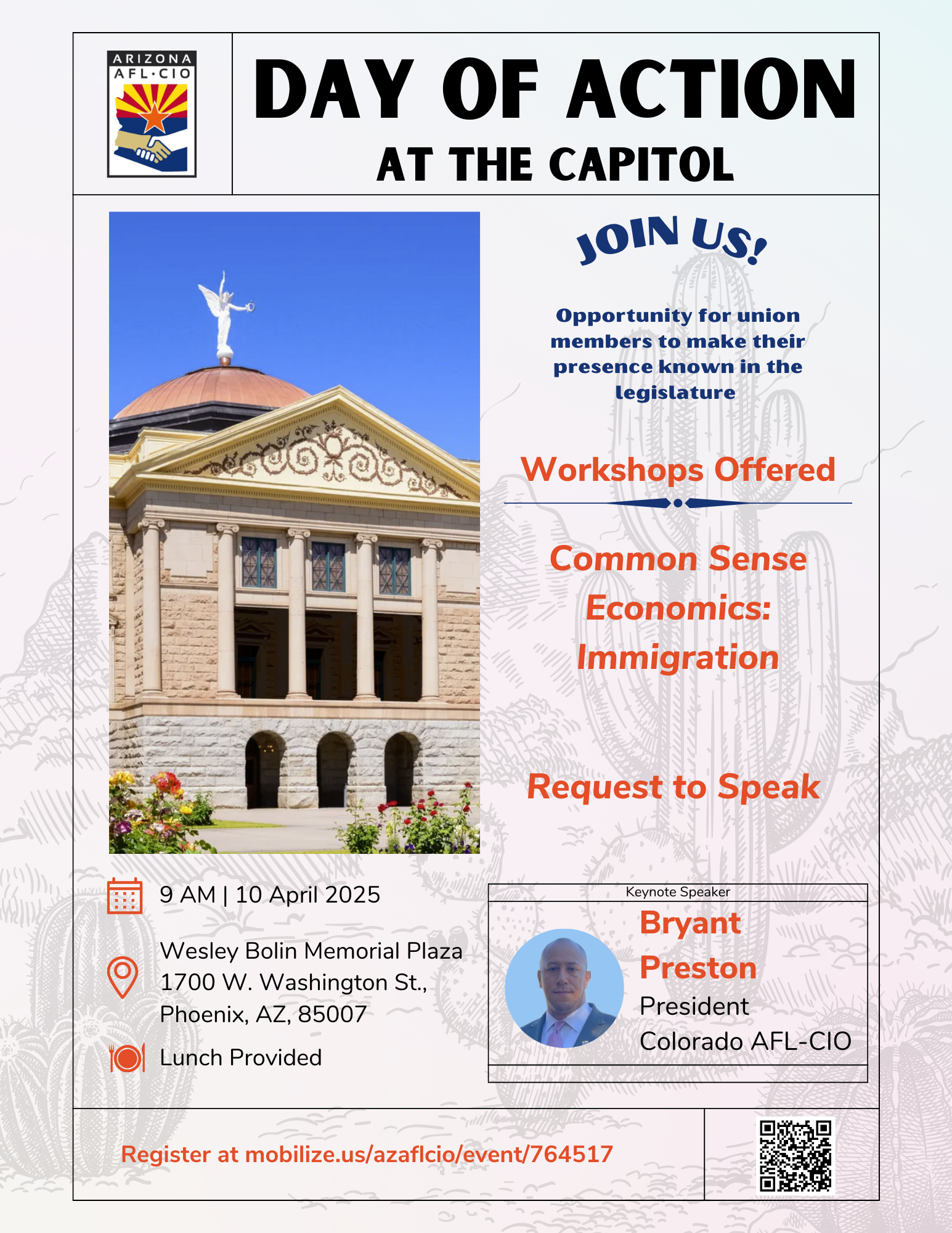 We would like for you to join us for our 2025 Day of Action at the Arizona Capitol on April, April 10th! This event allows union members to make their presence known in the legislature and advocate for the issues that matter most to working families in Arizona.