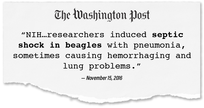 An NIH laboratory kills beagles in painful septic shock experiments.