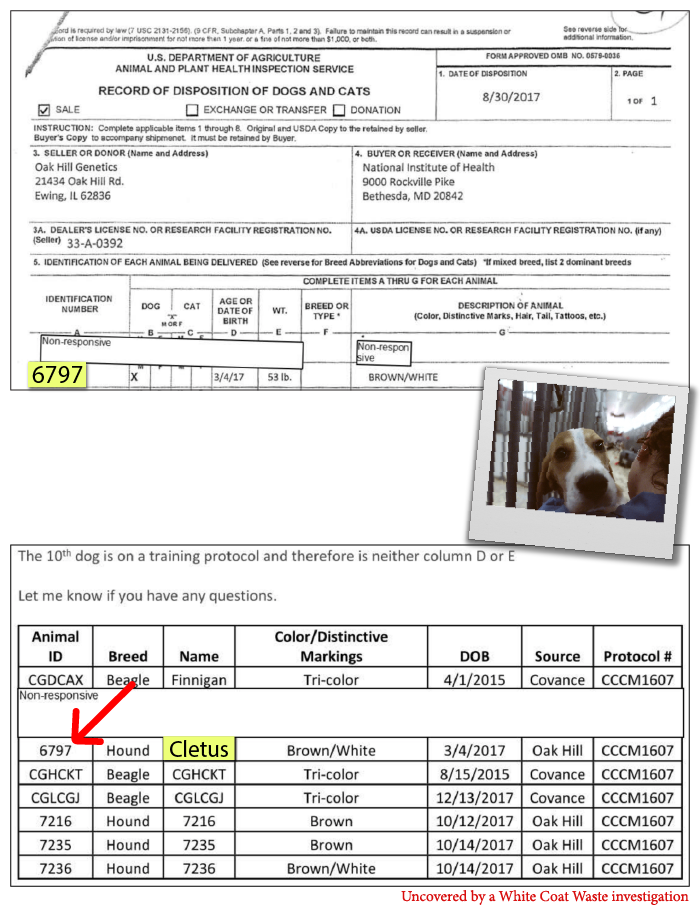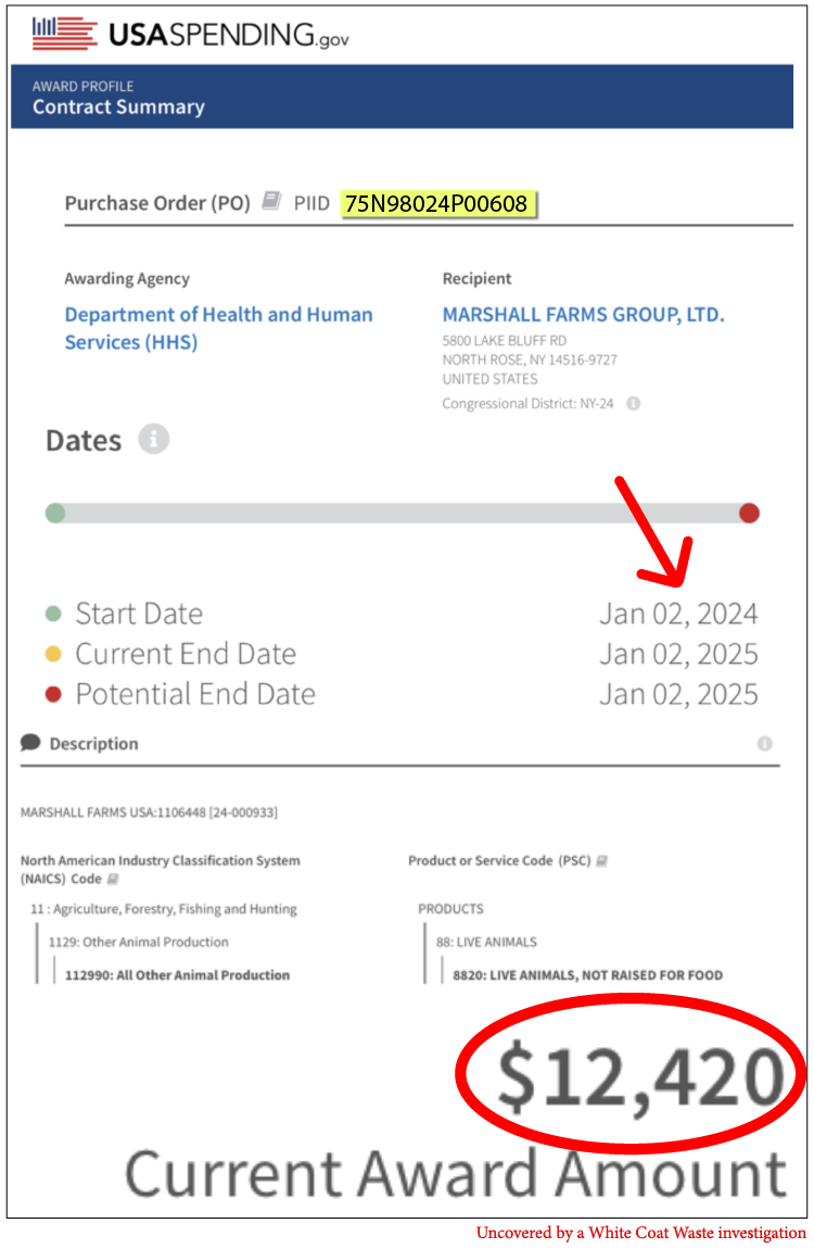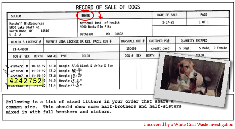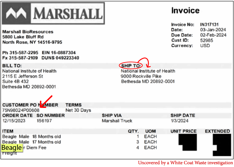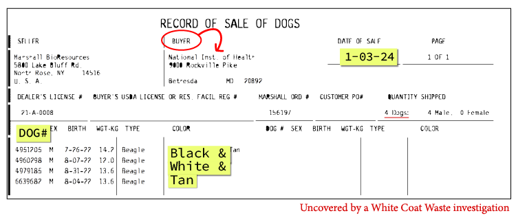 This is Marshall’s sale record from January 2024. It confirms the NIH spent $12,420 for four dogs—beagles with black, white, and tan markings.