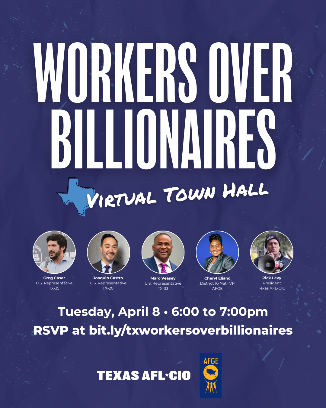 Tuesday, Apr. 8 online: Workers Over Billionaires: Virtual Town Hall with Texas Federal Workers & Members of Congress