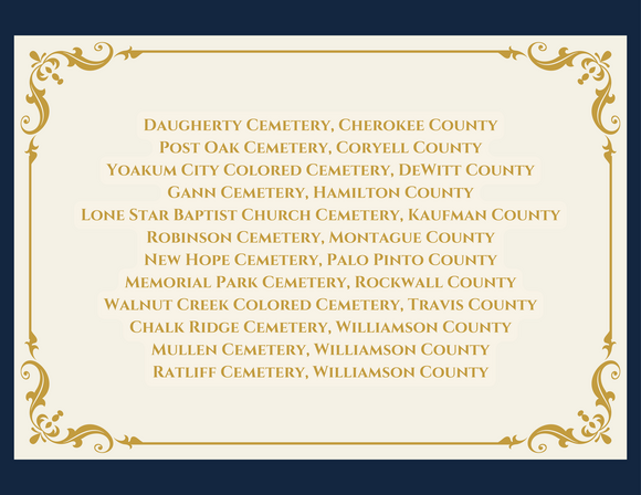 Alt-text: Daugherty Cemetery, Cherokee County; Post Oak Cemetery, Coryell County; Yoakum City Colored Cemetery, DeWitt County; Gann Cemetery, Hamilton County; Lone Star Baptist Church Cemetery, Kaufman County; Robinson Cemetery, Montague County; New Hope Cemetery, Palo Pinto County; Memorial Park Cemetery, Rockwall County; Walnut Creek Colored Cemetery, Travis County; Chalk Ridge Cemetery, Williamson County; Mullen Cemetery, Williamson County; Ratliff Cemetery, Williamson County