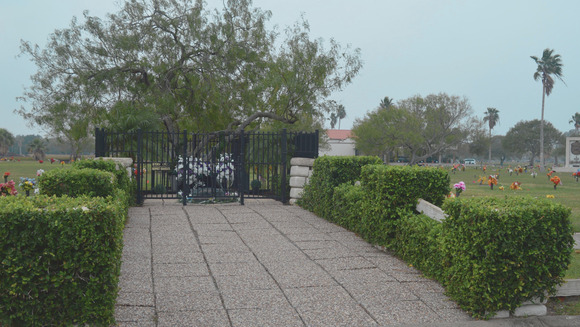 Purple flower offerings are often left by visiting fans, brightening the black granite gravesite with the iconic colors of Selena’s music and fashion. Selena’s faith as a Jehovah’s Witness is reflected in the bible passage inscribed below a bronze plaque with the image of her face: