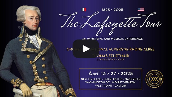 REVIEW: 'The Lafayette Musical' Brings Enlightenment Swagger & Suspense to D.C.'s Kennedy Center.There's still time to catch the final performance, in Pennsylvania, too.The Lafayette Musical, an “Immersive Bicentennial Tour,“ concludes Sunday in Easton, Pennsylvania, at the aptly chosen Lafayette College. Having also played in Charleston, New Orleans, West Point, and Washington, D.C.’s recently politically tumultuous Kennedy Center, the show serves as a reminder of the leap from trite political adages to lasting cultural adagios. Governance is scarcely about the here and now. Politics, as with accomplished art, is almost always a battle for tomorrow–a small-p ‘progressive’ theme (think Jefferson, not Jeffries), which gently unpins the performances by conductor Thomas Zehetmair and his 25-piece French National Orchestra of Auvergne-Rhône-Alpes. The performance featured Joseph Bologne, also known as the ‘Black Mozart’; Ruth Crawford Seeger; Mozart; Zehetmair; and Beethoven. Interspersed between the pieces were five chapters of an on-screen, animated tale of Lafayette’s revolutionary life, commemorated in 2025 to mark two hundred years since the Major General toured the America he had helped to free almost fifty years prior. Lafayette, at just nineteen, had decided upon vengeance on the British for his nation’s humiliation during the Seven Years’ War and, more crucially, for the death of his father when Lafayette was just two. Having served as honorably as any Frenchman could, Lafayette returned to America, having watched his own nation’s attempt at political enlightenment result in the Reign of Terror and the rise and fall of Napoleon Bonaparte. This is the journey the production team at HolyMage, alongside Zehetmair and his orchestra, embarks upon with the audience. A narrator, often humorous, tells of Lafayette’s accomplishments, with stunning visuals projected as a backdrop. The choice of Bologne, also known as the Chevalier de Saint-Georges, and his Anonymous Lover is as obvious as elegant. Bologne, the illegitimate, mixed-race son of an accused murderer, lived as wild a life as Lafayette. A composer, soldier, and champion fencer–all against the backdrop of a French society in turmoil and an establishment often baffled by Bologne’s race. When the Anonymous Lover was released, Bologne was fighting for control of the Paris Opera, while Lafayette was fighting the British in Virginia. Both men lived in high society and, at times, as scapegoats and exiles. Seeger’s Andante for Strings presents a jarring pivot–ominous, haunting, and tortured. A horror-movie jump-scare could come any moment, but never arrives. Instead, simply awe-inducing discomfort from the counterpoint, something for which Seeger was partly famed. As Lafayette may have felt while attempting to cross the Atlantic westward, or indeed as he would have endured during his stint in prison, Seeger’s piece feels never-ending for being so brief, and in the end, exits on its back foot. Like the promise of an early, grisly death that never befell the Frenchman in all his battles. Mozart’s K. 219 arrives on cue. A gentle palate cleanser at first, but then a blast of maturity, as Lafayette grows from fiery rebel to beloved statesman. The piece builds to majesty, like Handel’s Zadok, and brings plenty of foreign influence, just like the Marquis in America. Zehetmair took his chance to show off at the Kennedy Center, airing his recently premiered Passacaglia, Burlesque, and Chorale, which, almost through passion alone, bridges the traditional-contemporary divide that typified the performance. Closing on Beethoven’s Great Fugue, another (small-p) progressive masterpiece, the theme arrives home. The piece was composed a year before America’s 50th birthday and, much like an independent America, especially to the surrendering Brits, was hardly well received. Confusing and challenging, Russia’s Igor Stravinsky called the Great Fugue “an absolutely contemporary piece of music that will be contemporary forever,” which, on the precipice of America’s 250th anniversary, feels exceptionally apt–not just as a bridge between past and present, but a reassurance between present and future. As America arrives at its semiquincentennial, the political tug-of-war between the progressive and the traditional is not best highlighted by political adages, but by the adagios. Zehetmair, HolyMage, and the Orchestra of Auvergne-Rhône-Alpes do Lafayette and the enduring ideals an immense justice. Raheem Kassam's Substack is free today. But if you enjoyed this, you really should consider supporting our work! |