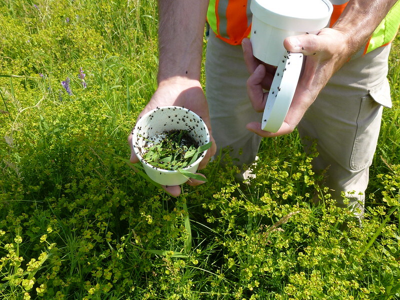 Leafy spurge beetles are released from a container into a patch of leafy spurge plants.