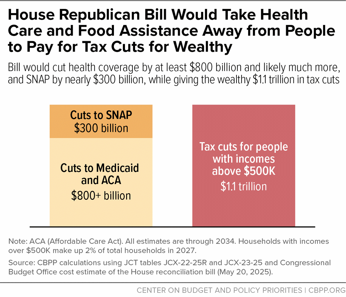 The bill includes $715 billion in cuts to Medicaid and $300 billion to food assistance programs over the next decade. These cuts would be used to fund massive tax breaks for billionaires and large corporations. According to analysts, individuals earning $1 million or more per year would receive nearly $90,000 annually in tax breaks, while families earning under $50,000 would get less than $1 a day in relief.
